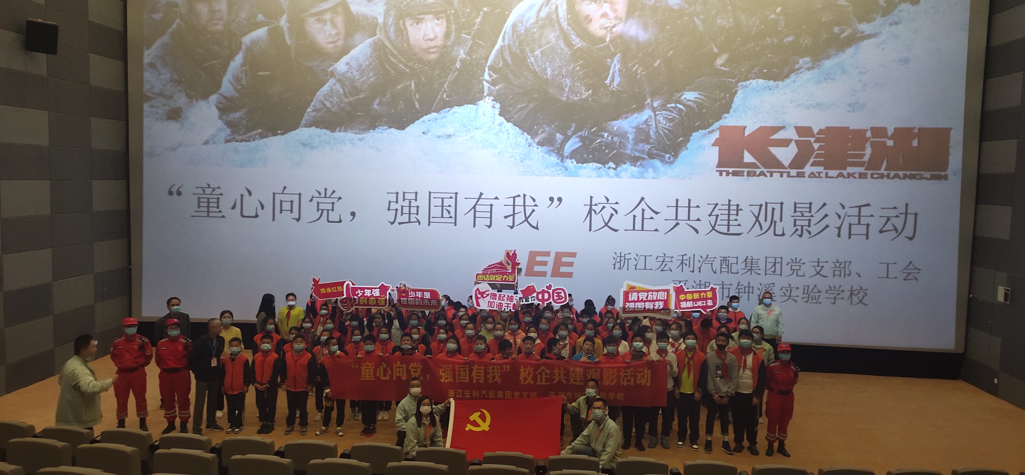 金秋十月,秋風送爽,浙江宏利汽配集團黨工委攜手平湖市鐘溪實驗學校,開展“請黨放心,強國有我”觀影活動。宏利黨工委自成立伊始即與鐘溪實驗小學結成“校企共建”,每年組織 “助學、助教、助建”活動。此次活動創(chuàng)新活動載體,在集團黨支部,各公司工會的大力支持下,近20余人參加與組織六年級三個班近120余人組織觀看《長津湖》。